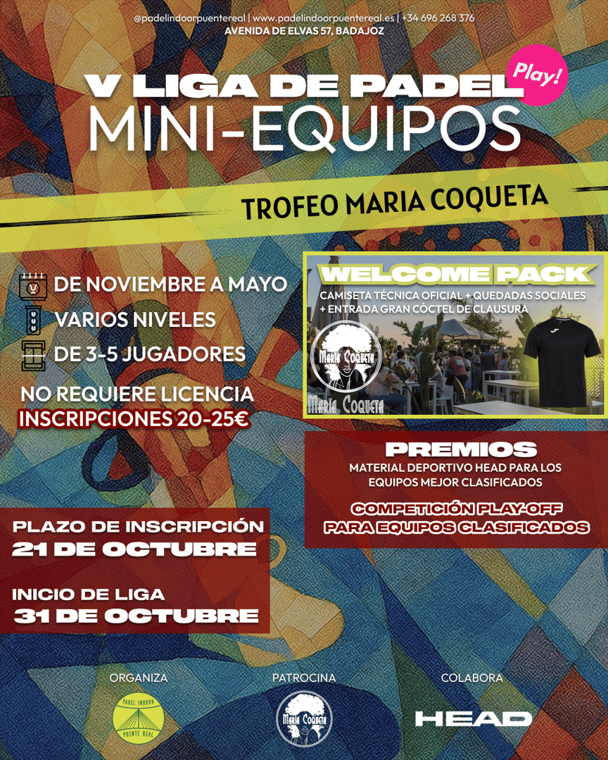 Con una participación de 54 equipos la edición pasada, esta temporada buscamos consolidar el nº de equipos y ofrecer una experiencia dinámica e inmersiva de pádel y ocio a todos los participantes. Como '𝘮𝘢𝘪𝘯 𝘴𝘱𝘰𝘯𝘴𝘰𝘳' está María Coqueta, referente en el ocio y hostelería en nuestra ciudad, quienes se encargan de ofrecer la parte más social de este nuestro deporte, el pádel. Con sus ‘tardeos’ y fiestas sin igual.